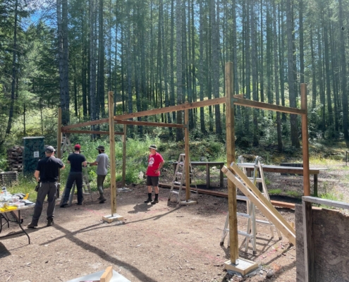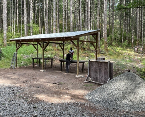 Volunteers were hard at work over the last few weekends down at the Airsoft field, setting foundations and putting up beams for a new shooting shelter.